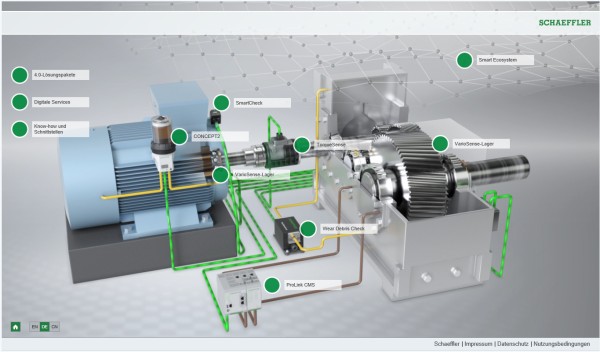 Schaeffler a développé des concepts pour transférer différentes applications clients dans le monde digital et les optimiser de manière globale. Les concepts de plateformes combinent des produits mécatroniques, des systèmes de surveillance conditionnelle et des services digitaux pour créer des ensembles de solutions 4.0 spécifiques aux applications. Sur cette base, des offres concrètes spécifiques aux clients peuvent être développées, tout en mettant l’accent sur l’efficacité globale de l’installation.